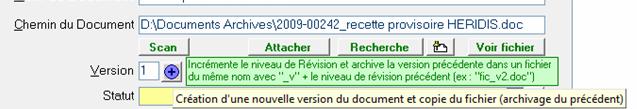 Pour créer une nouvelle version d’un document il faut d’abord ouvrir la version archivée dans MicroGED et cliquer sur le bouton + à côté du numéro de version, le bouton incrémente le numéro et apparaît l’onglet gestion des versions.